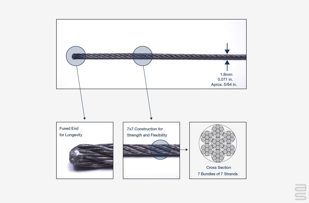 - Material 1.8 mm Stainless Steel Cable made of 7x7 strands for flexible strength.