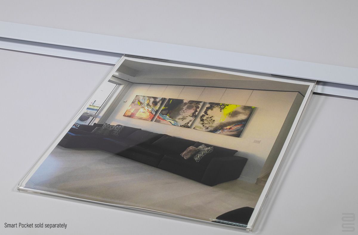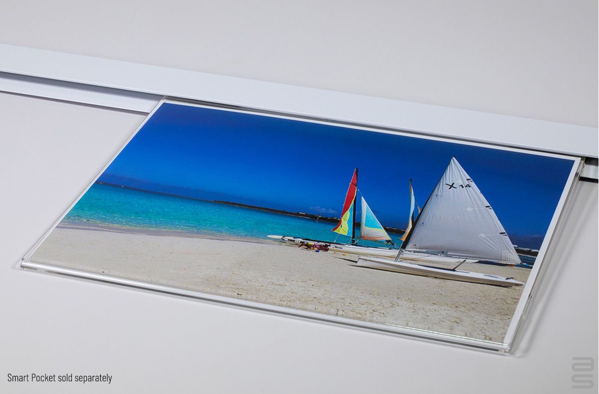 Smart Pockets are available in the letter (8,5x11) and tabloid (11x17) formats, portrait or landscape orientations. The rail is available in the size of 72 inches in a black or white finish.