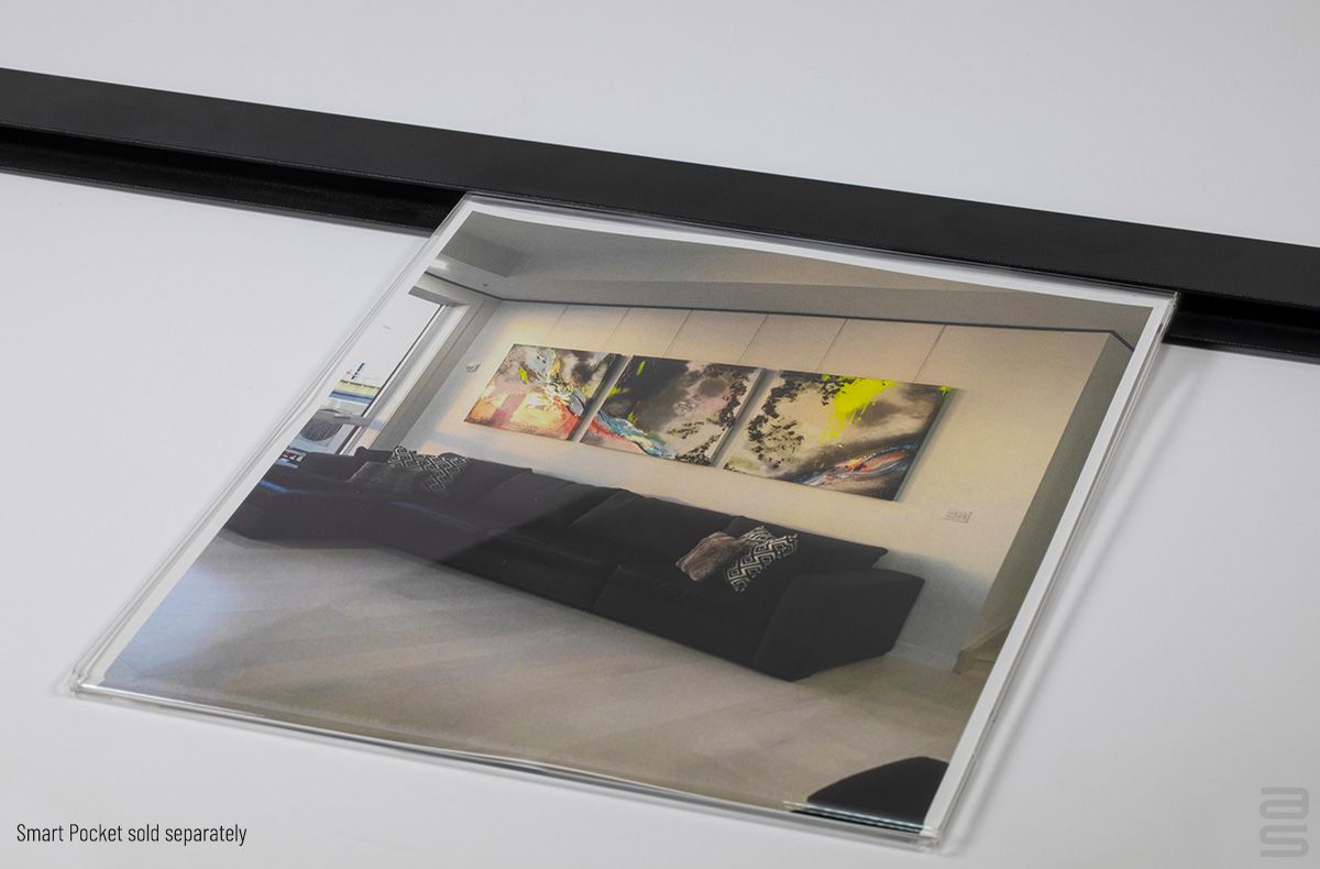 The Smart Pocket Rail is fixed to the wall with the included mounting hardware. The Smart pocket is insert into the picture rail system and can be removed, changed, or added quickly. An easy solution for improved, more stylish presentation of pictures, ideas and information. Because of the notch at the back and side of the pocket, you can change the content very quickly and easily, without having to remove the Smart Pocket from the rail.